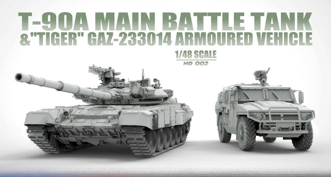 Vendor:Suyata1/48 T-90A MAIN BATTLE TANK & “TIGER” GAZ-233014 ARMOURED VEHICLE by SUYATA SUYATA NO-002 1/48 T-90A MAIN BATTLE TANK & “TIGER” GAZ-233014 ARMOURED VEHICLE This is a very ambitious and innovative kit set from Suyata. The Set consists of: 1/48 Russian T-90A Main...