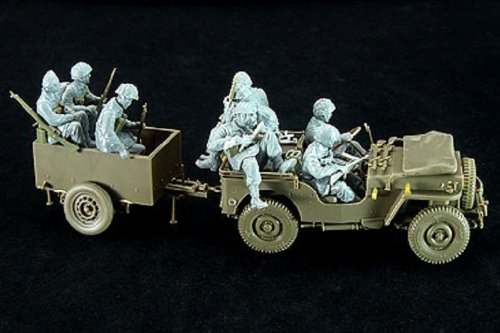 Vendor:Bronco Models1/35 BRITISH AIRBORNE TROOPS RIDING IN 1/4 TON TRUCK/TRAILER BRONCO MODELS CB35169 1/35 scale plastic model kit of British Airborne troops riding in a 1/4 ton truck with trailer.