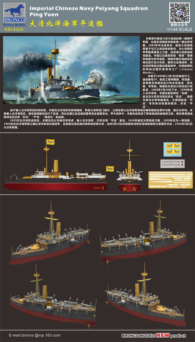 Vendor:Bronco Models1/144 Imperial Chinese Navy Peiyang Squadron Ping Yuen by Bronco Model BRONCO KB14005 1/144 Imperial Chinese Navy Peiyang Squadron Ping Yuen by Bronco Model This ship is the first steel armored warship designed and built by China itself, and the first...