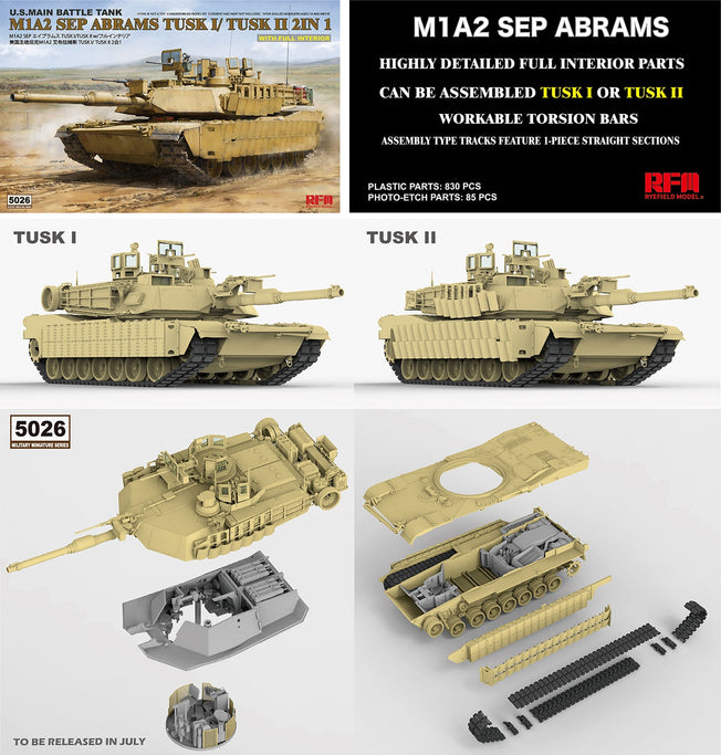 Vendor:Rye Field Models1/35 M1A2 TUSK I/TUSK II WITH FULL INTERIOR RYEFIELD MODEL 5026 1/35 scale plastic model kit of the M1A2 Tusk I/Tusk II with full interior.