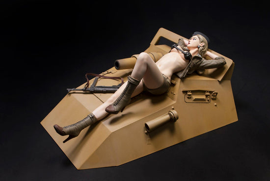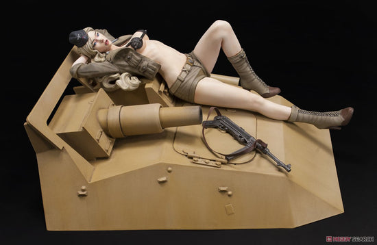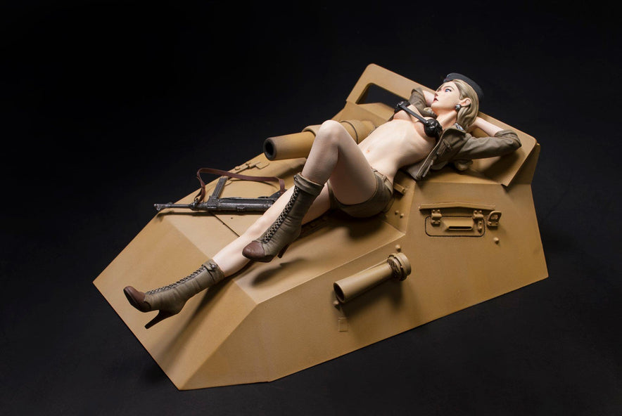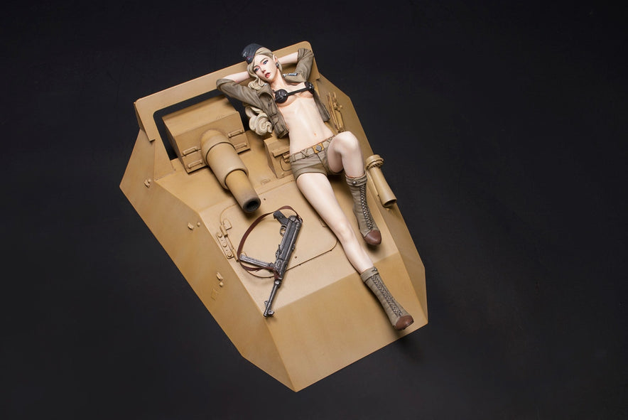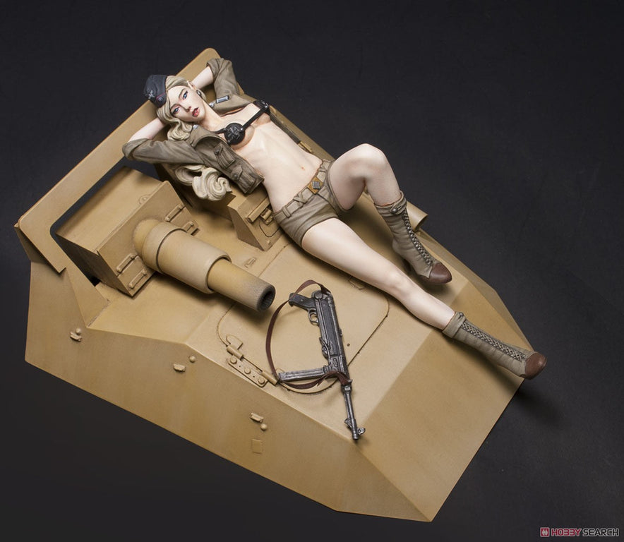 1/12 Sd.Kfz 233 Valkyrie “Helene Rommel” uniform as WWII Afrika Korp. Helene is posed resting on the hood of the Sd.Kfz.233 6 Wheels Armored Car. Relaxing while staying alert with her MP40 machine pistol by her side.