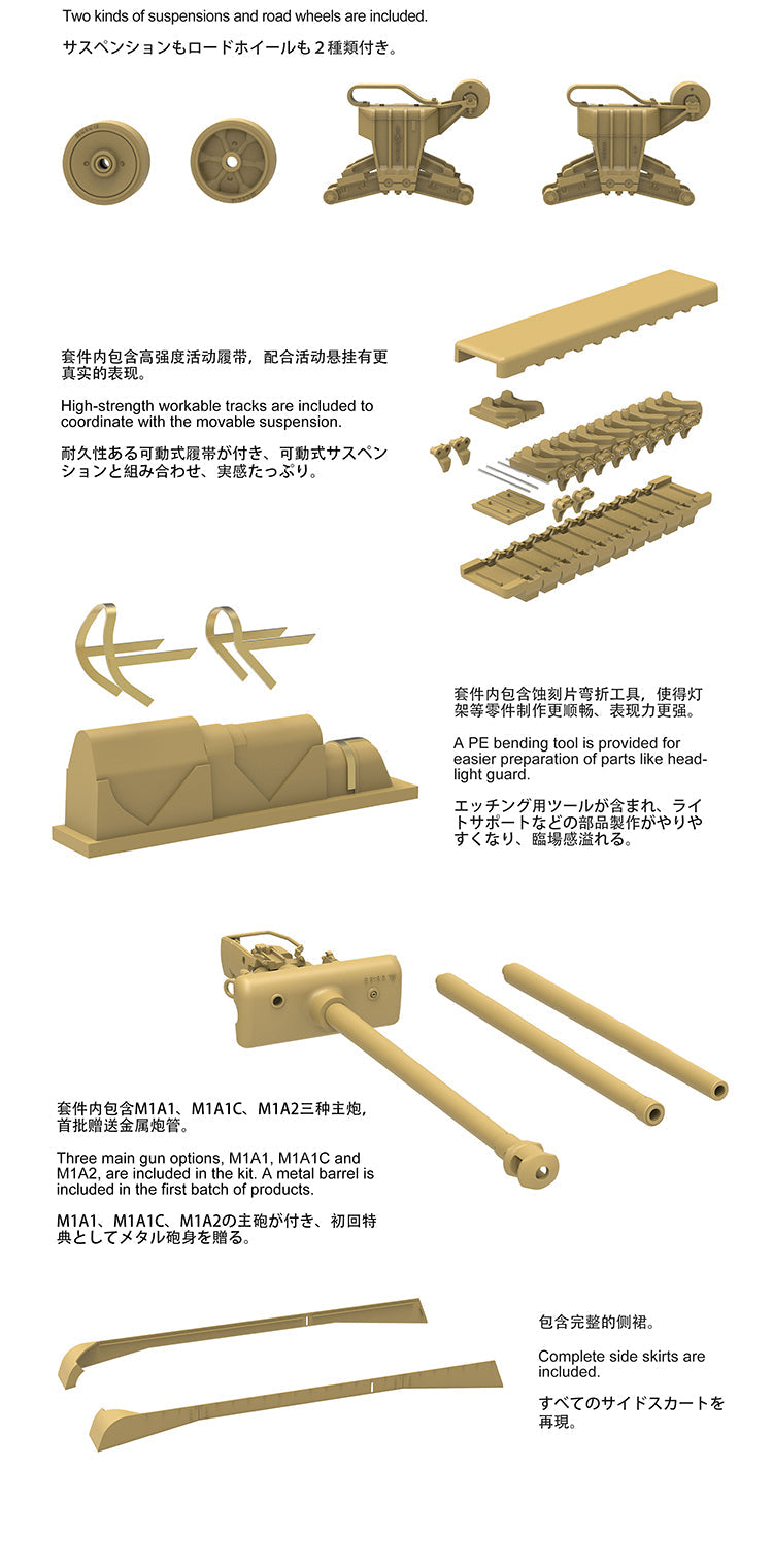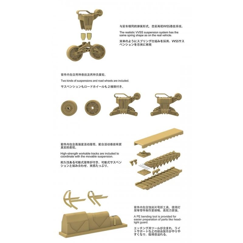 Kit features movable unsuspension system with real metal coil springs. Individual track links for maximum realism.